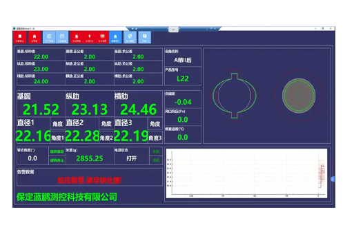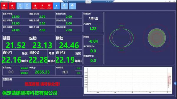 10)測量數(shù)據(jù)“超差”、測徑儀溫度“超溫”、風(fēng)機(jī)壓力過低自動(dòng)報(bào)警功能。