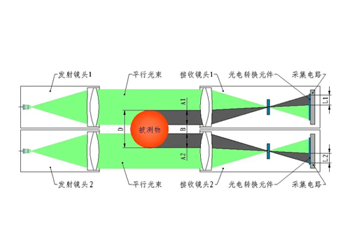 圖中2套發(fā)射鏡頭分別發(fā)射出平行光射向2套接收鏡頭,通過接收鏡頭內(nèi)的透鏡使平行光束在光電轉(zhuǎn)換元件CCD芯片上成像。當(dāng)2束平行光內(nèi)放入被測物時(shí),在光電轉(zhuǎn)換元件的像上就會(huì)出現(xiàn)陰影,設(shè)其寬度分別為L1、L2。經(jīng)過對(duì)光電轉(zhuǎn)換元件發(fā)出的電信號(hào)的處理和計(jì)算可以得出L1、L2所對(duì)應(yīng)的尺寸A1、A2,A1加A2再加上兩個(gè)鏡頭之間的凈間距B即可得出被測物的尺寸D。