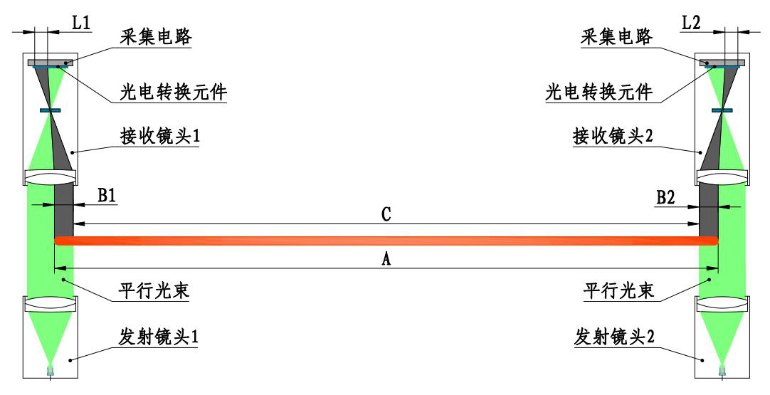 設(shè)備采用雙測頭測寬原理對板材的寬度進(jìn)行測量,測頭豎直布置,可測量板面呈水平狀態(tài)下通過的板材寬度。測寬儀的雙測頭分別獨(dú)立設(shè)置在套滑臺模組上,且每個測頭處增設(shè)廣角測頭,通過廣角測頭監(jiān)測的板材邊緣位置調(diào)整寬度測頭的位置。測寬儀主要配置上位機(jī)控制系統(tǒng)、外接LED顯示屏、高壓離心風(fēng)機(jī)等,可增配嵌入式智能模塊。